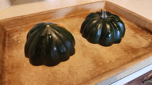 Begin by cutting your acorn squash in half. Remove the seeds/strings by scooping them out with a spoon. Rub with olive oil and place face down on a greased baking sheet. Cook in oven at 400 degrees for 1 hour.