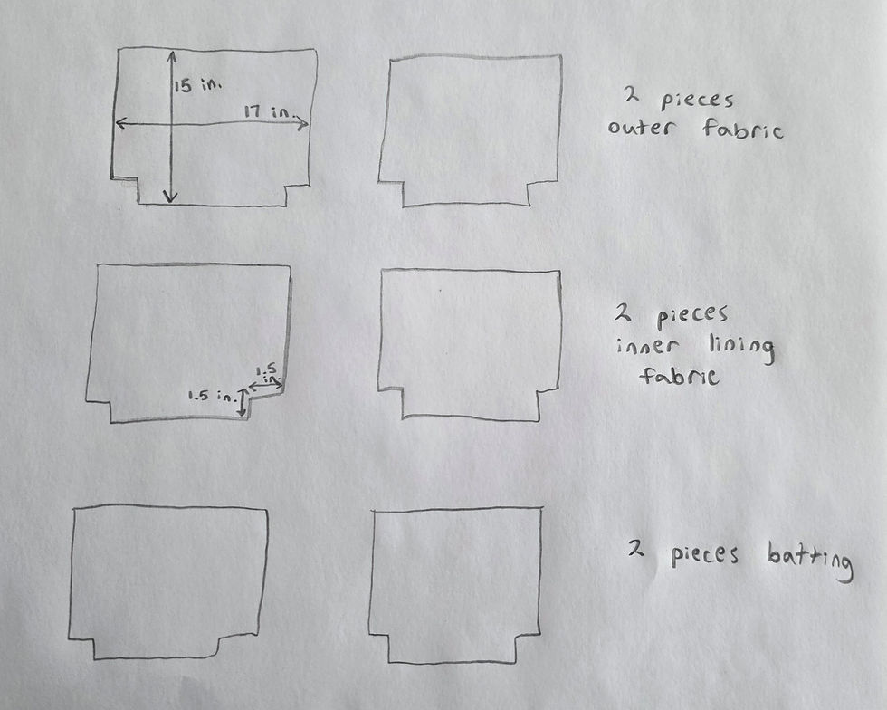 Cut out two pieces of batting, also 17 inches wide by 15 inches tall. Cut out 1.5 inch squares from bottom two corners.