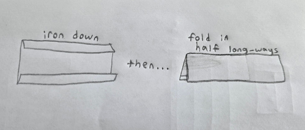 Fold the fabric lengthwise (about 1/2 inch on each side), ironing down both edges. Fold the fabric in half lengthwise and iron down. Using a 1/4 inch seam allowance, sew strap on both sides (long ways) to secure.